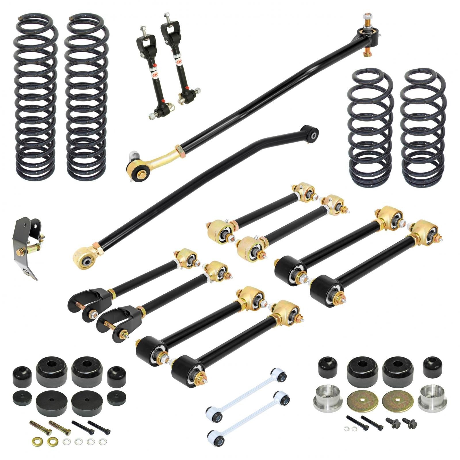 Included in this kit is the full set of 8 Johnny Joint adjustable control arms, double adjustable uppers), set of 4 progressively wound coil springs, front and rear bump stop kits, Johnny Joint adjustable front and rear trac bars, rear trac bar geometry relocation bracket and extended, adjustable front and extended rear sway bar links.